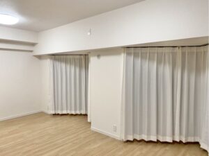 白いカーテンとフローリングの調和が美しく、清潔感のある仕上がりです。