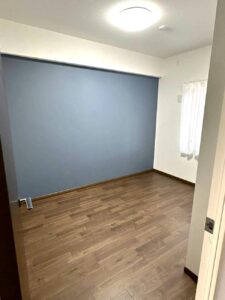 写真にあるブルー系のアクセントクロスは、主張しすぎない色味を選び、